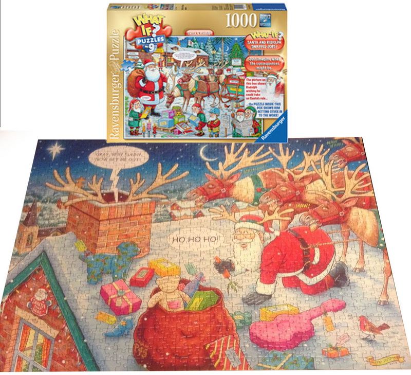 Christmas Eve is a very busy night for Santa, as he drives the sleigh, scrambles down chimneys and delivers presents across the world. Rudolph reckons Santa has an easy time of it, eating mince pies and drinking sherry, whilst all he gets is a raw carrot. So WHAT IF Rudolph and Santa swapped jobs? And WHAT IF Rudolph really got stuck into his new role? The picture on this pack shows Rudolph’s usual situation. the puzzle inside the box shows what COULD HAPPEN if he changed jobs.