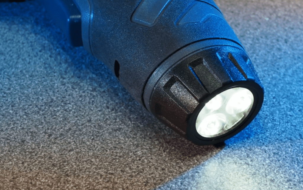 It features a small LED that triggers when you pull the start button. It’s not a searchlight, but it’s exactly what you need when you’re squinting into the dark recesses of a wardrobe.