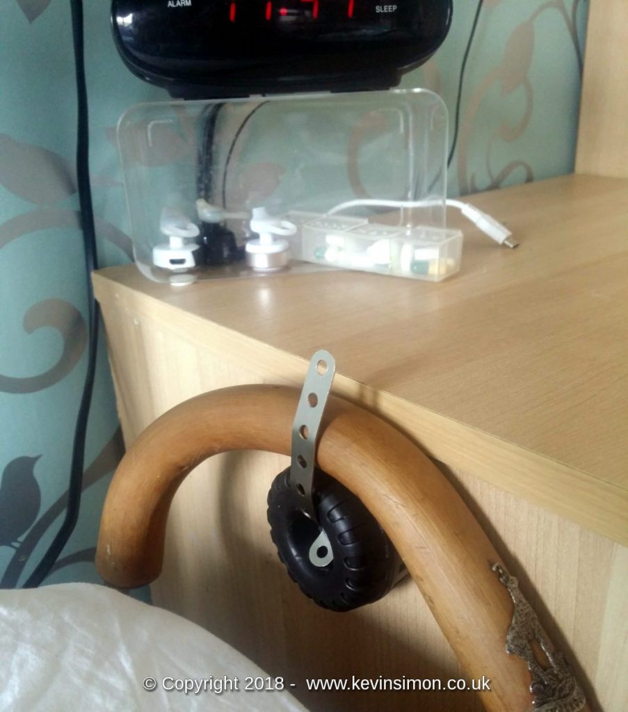 Unfortunately due to a spinal problem I have, there are a fair few times that I have to use a walking stick around the house and definitely in the mornings, so needed somewhere to have my walking stick in reach by the bed for in the night or morning, so came up with this simple idea.