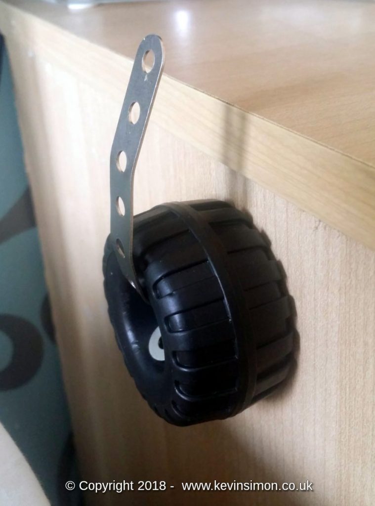 I needed something with a curve on so a wheel was perfect and because the hole in the wheel was bit larger to fit a screw in, used a deep washer. To stop the cane from falling off the wheel when attached I used a straight strip that bent to the shape of the inside of the wheel, then a screw goes through this then through the washer in the wheel and screwed into to bedside drawers, Our bedside drawers are now a few years old ikea ones, so not really a problem putting a screw hole in.