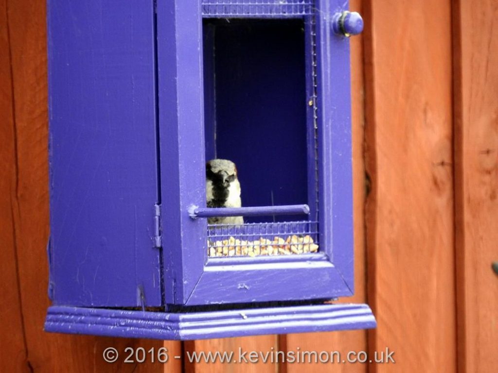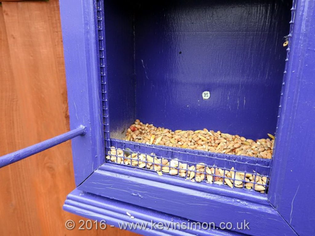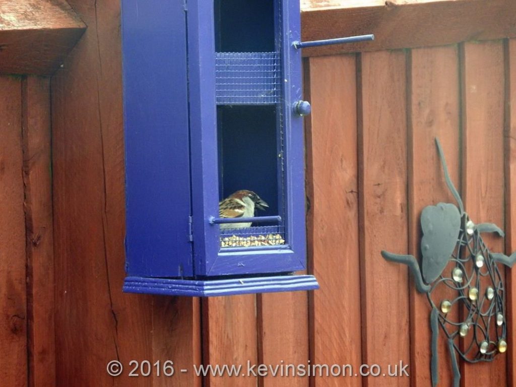 Once all this was done I had some blue spray paint left over from another project, so spayed the new bird feeder. I like the finished project as does remind me of the doctor who tardis. The feeder then was screwed into the fence. We have put some bird seed in but so far the birds haven’t had any out of the main feeder though have been having some of the seed that have been putting on the top of the unit.