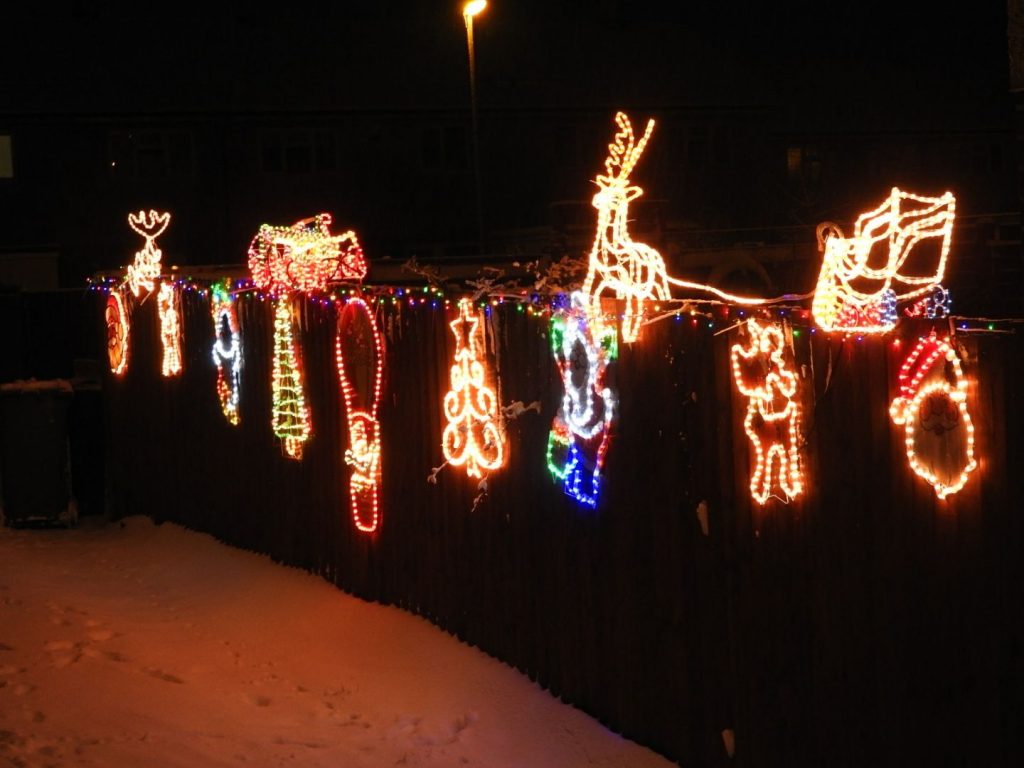 So on the Friday which we did have a inch or two of snow I made a start by putting the rope light silhouettes along our fence. The previous years I normally build a shelf platform on the garden side of the fence and put large plastic light up figures and Christmas trees etc, this year it was going to be to much for me, as we had 3 different 3D rope light shapes a reindeer with sleigh, train and carriages and a reindeer. So decided just to put these up and using some cheap brackets on the inside and screws and cable ties the other was enough to hold them up.