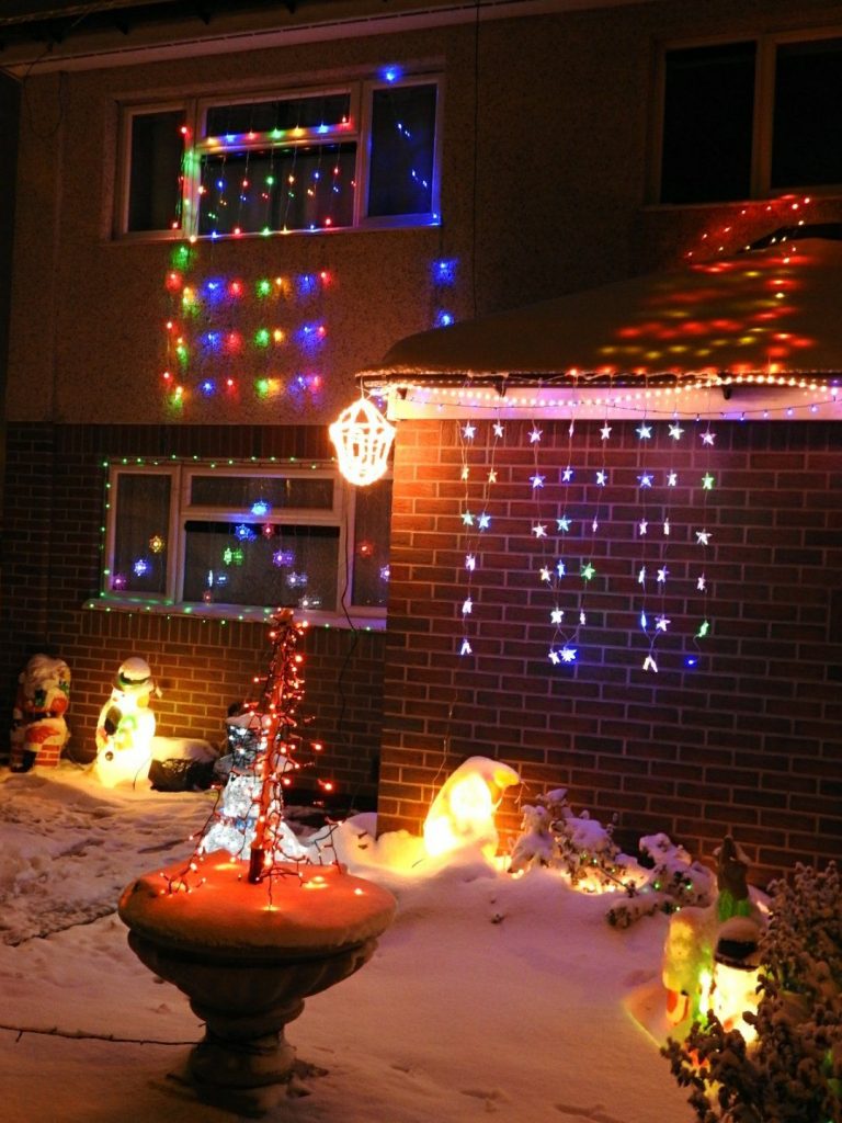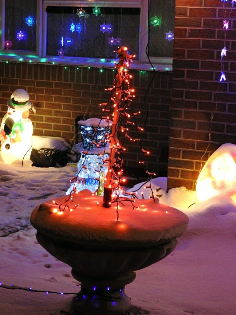 The Saturday me and the missus started the front, I was just going simple this year with just led lights at the front, we had new lights that I brought in the sales earlier in the year so out up some on the windows both upstairs and on the kitchen window. Also around the arch way, a few months ago we did the front garden with a small water feature fountain that at the moment is turned off, I thought I would be nice to the lights on this like the water was coming down. I used a bit of plastic pipe the make the fountain higher and with red chaser lights using cables ties had them going up the pipe then down to the edges of the water feature bowl.