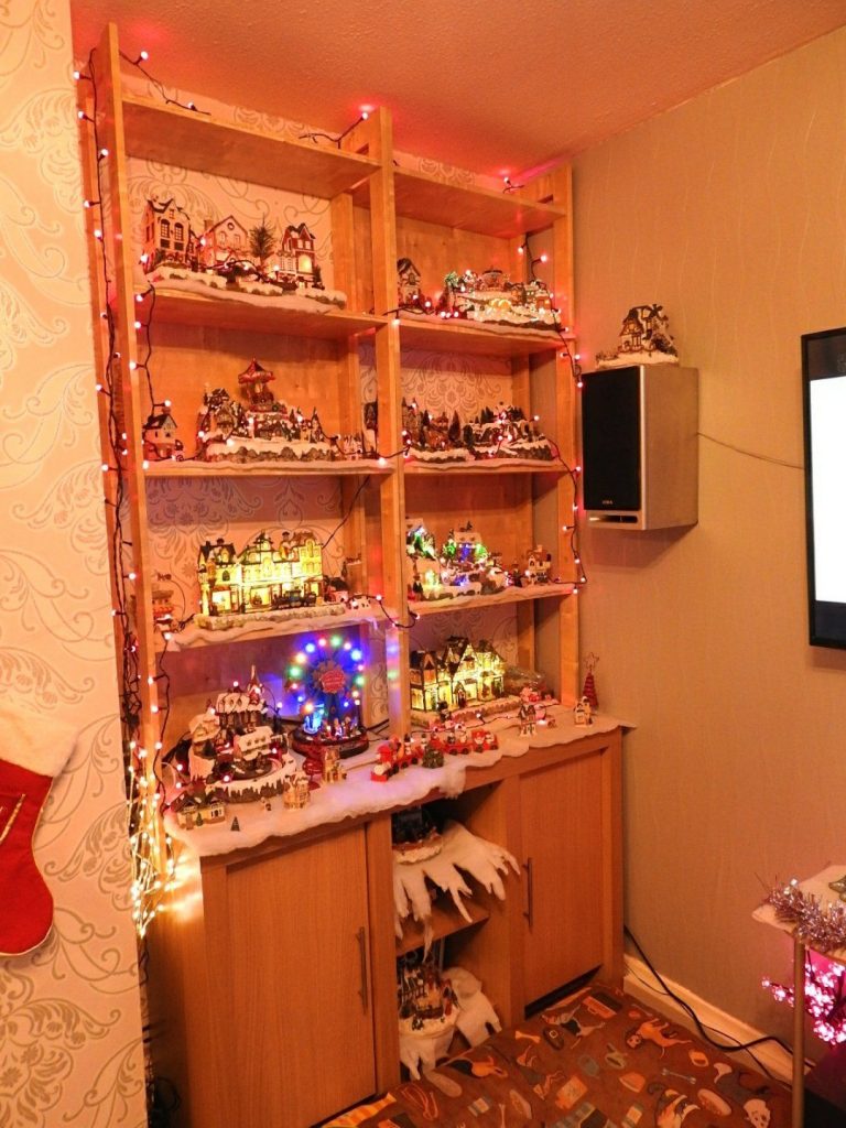 Inside is mostly the missus domain the same silver Christmas tree with light pink and purple tinsel and ornaments. I had brought some more Christmas village light up models but as we have had a reaming in our living room, we no longer had a bookcase, so I brought two wooden open bookcases from ikea to sit on top of our sideboard. They were the cheaper ones from ikea costing £34, but I had to cut down the one side of each so that fitted flat on top of the sideboard. We decorated with snow sheets and then the models on as well as some pink lights around as some of the older models no longer light up.