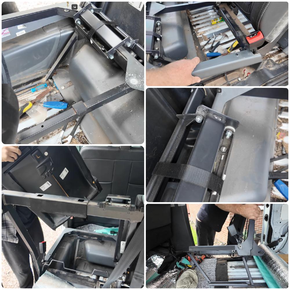 Step 3: Seat Padding: The seat pads remove different depending on which one, so here’s the basics, though easy when you look at them. Middle and passenger side : Undo hex bolts on the hinged seats, mine had strap around the hinges so removed those, This then allows for the storage tray to be removed from the back. This is in two parts there maybe rivets that need drilling out on the top part . Driver side: this one just clips there is a metal bar underneath so it can be tricky to get out.