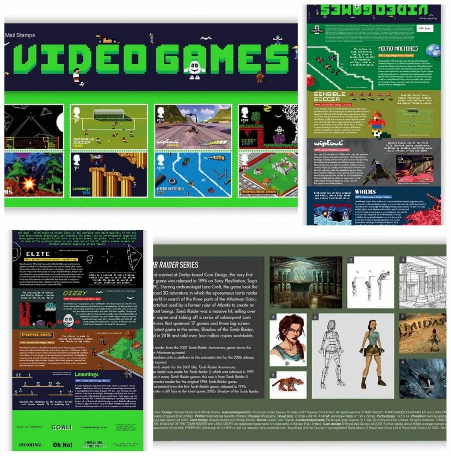 Your Presentation Pack contains all eight Special Stamps and the Tomb Raider Miniature Sheet. The Special Stamps depict scenes from landmark UK-designed titles from the 1980s and ’90s.