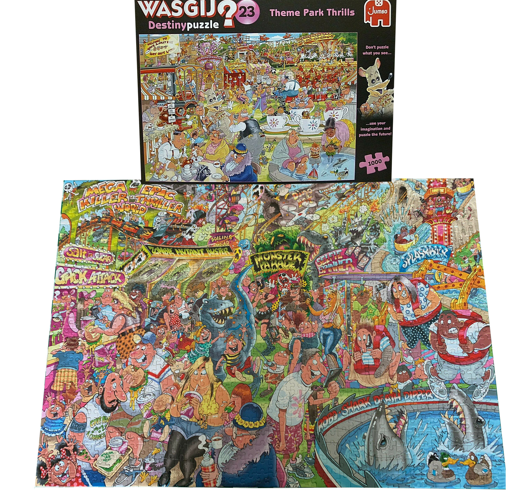 Wasgij Destiny 23: For decades families have been drawn to the fun and excitement of amusement parks. ‘Have a Jolly Nice Day Out Land’ is filled with charming family-friendly attractions including vintage carousels, teacups and kitten rides, coconut shies, and a tired-looking mascot posing for pictures.