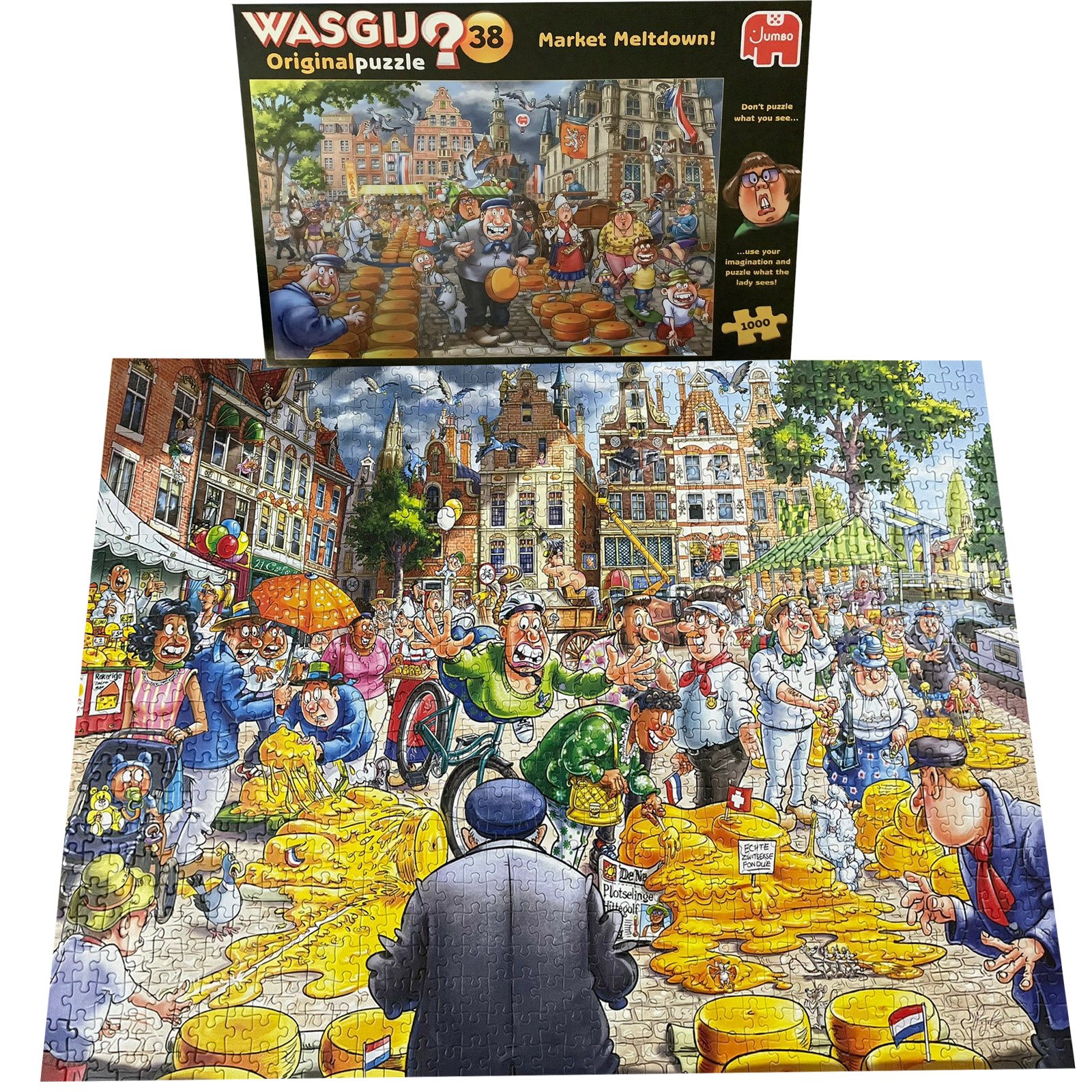 Wasgij Original 38: The Dutch cheese market is busier than ever, with locals and tourists alike gathering to purchase some local delicacies – even the dark clouds can’t dampen their spirits! Luckily for them, the sun has broken through the gloom and started to shine brightly on the market stalls below, but why does the sudden change in weather take everyone by surprise?